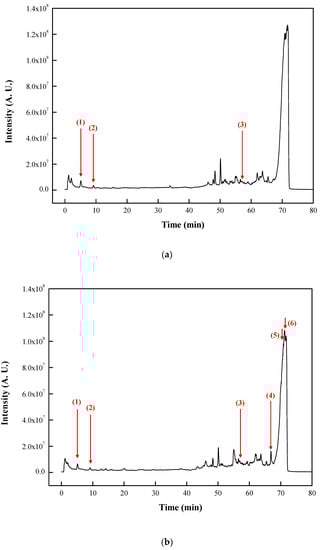 Liquid chromatography–mass spectrometry results of (a) Momordica charantia L. and (b) Momordica charantia L. var. abbreviata Ser. juice. Identified components included (1) phenylalanine; (2) tryptophan; (3) balsaminoside C; (4) goyaglycoside G; (5) vicine; and (6) momordicoside Q.