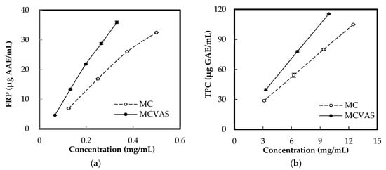 Figure 4 illustrates the effects of the concentration on FRP and TPC in MC and MCVAS. As observed in Figure 4a, the FRP of MC and MCVAS increased with concentration. The FRP of MCVAS was higher than that of MC, and the effect of concentration on FRP for MCVAS was stronger than that for MC. Through regression analysis, the FRP values were determined to be 68.93 ± 3.32 and 118.14 ± 17.60 mg of AAE/g DW for MC and MCVAS, respectively. This corresponded to the reported FRP value of 10 ± 0.4 mg of GAE/g for bitter gourd [43] (approximately 87.02 mg of AAE/g by conversion [44]). Figure 4b shows the values of the TPC increasing with rising concentration and the nearly linear relationship between TPC and concentration. Moreover, the TPC of MCVAS was higher than that of MC, and the effect of concentration on TPC was more conspicuous for MCVAS than for MC. Through regression analysis, the TPC values were determined to be 8.15 ± 0.51 and 11.47 ± 0.49 mg of GAE/g DW for MC and MCVAS, respectively. Table 2 summarizes the FRP and TPC values of MC and MCVAS in this study for comparison.