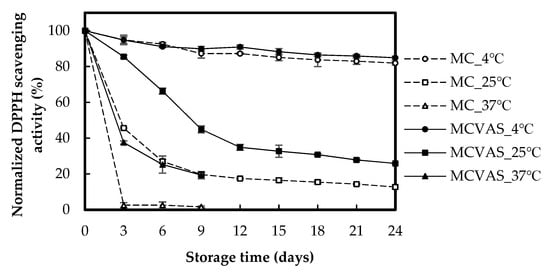 Figure 5 presents the DPPH scavenging activities of MC and MCVAS kept at varying temperatures for different storage times. The normalized DPPH scavenging ability of MC decreased from 100% to 81.90% when kept at 4 °C for 24 days, to 12.71% when kept at 25 °C for 24 days, and to 1.62% when kept at 37 °C for 9 days. After 3 days, the normalized DPPH scavenging ability of MC had decreased by 97.41% when stored at 37 °C and by 54.36% when stored at 25 °C. However, only a 5.15% decrease was noted for that stored at 4 °C. The normalized DPPH scavenging ability of MCVAS decreased from 100% to 84.87% when kept at 4 °C for 24 days, 25.47% when kept at 25 °C for 24 days, and 19.33% when kept at 37 °C for 9 days. Substantial changes in the DPPH scavenging activity of MCVAS occurred on the third day, and the activity decreased by 62.45% when kept at 37 °C. However, only 5.23% and 14.30% decreases were observed for that kept at 4 °C and 25 °C, respectively. Therefore, the DPPH scavenging abilities of MC and MCVAS decreased with storage time, and the decrease depended on the storage temperature. The loss of DPPH scavenging ability in MC with storage time was greater than that of MCVAS. The effect of storage time on DPPH scavenging ability was more prominent at higher storage temperatures, indicating that lower storage temperature could mitigate the decreasing DPPH scavenging activity. This result was similar to that reported by Myojin et al. [23], who indicated that DPPH scavenging activity decreased more at higher storage temperatures.