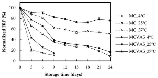 Figure 6 presents the FRP of MC and MCVAS under different storage times and storage temperatures. The value of normalized FRP for MC fell from 100% to 51.36% when kept at 4 °C for 24 days, to 8.86% when kept at 25 °C for 24 days, and to 10.62% when kept at 37 °C for 9 days. Moreover, a rapid decrease was observed on the third day, and MC kept at 37 °C had the largest decline in normalized FRP (78.70%). The normalized FRP of MC kept at 4 °C and 25 °C had decreased by 11.61% and 33.81% on the third day, respectively. The normalized FRP value for MCVAS declined from 100% to 76.15% when kept at 4 °C for 24 days, to 16.85% when kept at 25 °C for 24 days, and to 15.48% when kept at 37 °C for 9 days. On the third day, the normalized FRP values of MCVAS kept at 4 °C, 25 °C and 37 °C had decreased by 8.79%, 22.10%, and 55.98%, respectively. Therefore, a rapid decrease in normalized FRP occurred when kept at 37 °C. Similar to the results for DPPH scavenging activity, the decline in normalized FRP with storage time was more apparent for MC than for MCVAS. The results indicated that keeping the juice of MC and MCVAS at higher storage temperatures accelerated the decrease in normalized FRP.