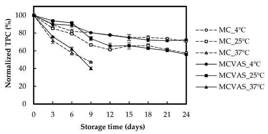 Figure 7 depicts the effects of storage time and temperature on TPC for MC and MCVAS. The normalized TPC for MC declined from 100% to 70.69% when kept at 4 °C for 24 days, to 57.46% when kept at 25 °C for 24 days, and to 47.35% when kept at 37 °C for 9 days. The normalized TPC for MCVAS decreased from 100% to 72.36% when kept at 4 °C for 24 days, to 55.87% when kept at 25 °C for 24 days, and to 40.11% when kept at 37 °C for 9 days. As shown in Figure 7, The TPC values of MC and MCVAS kept at 37 °C declined rapidly within 9 days, with declines of 52.65% and 59.89% observed in MC and MCVAS, respectively. Over 9 days of storage, the TPC values of MC and MCVAS decreased by 19.63% and 19.60%, respectively, when kept at 4 °C and by 33.46% and 26.24%, respectively, when kept at 25 °C. Overall, no clear difference between MC and MCVAS appeared during the 24-day storage. Compared with 25 °C and 37 °C, 4 °C was the optimal storage temperature. Higher storage temperature resulted in more decline in TPC, which was in agreement with the findings of a previous report [23].