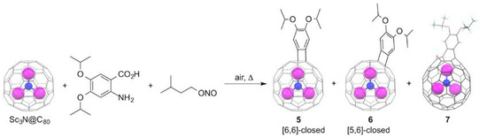 Cycloaddition reaction of Sc3N@C80 with 2-amino-4,5-diisopropoxybenzoic acid and isoamyl nitrite, to produce open-cage metallofullerene 7.