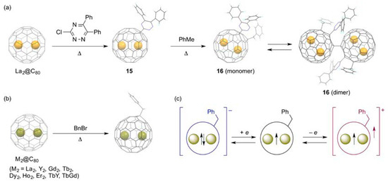 By contrast, we discovered, in 2015, that the monoaddition of a radical to a closed-shell EMF, La2@Ih(7)-C80, afforded a singly bonded fullerenyl radical as an air-stable product, as shown in Figure 5a [63]. The fullerenyl radical, La2@Ih(7)-C80–C3N3Ph2 (15), was synthesized by the thermal reaction of La2@Ih(7)-C80 and excess amount of 3-chloro-5,6-diphenyltriazine, under reflux in 1,2-DCB. The product was readily isolated by preparative HPLC. Subsequently, XRD analysis showed that the addition of the carbon-centered triazinyl radical took place at one of the carbon atoms shared by one pentagon and two hexagon rings, i.e., [5,6,6]-carbon atoms. The absorption spectrum of 15 exhibits broad absorption bands over the near-IR region down to 1300 nm, as a consequence of the paramagnetic nature. At this point, no meaningful NMR spectra were observed in 15. The paramagnetic character was confirmed from X-band EPR measurements, showing that the EPR spectrum of 15 resembled that of La2@Ih(7)-C80 anion radical. Detailed analysis revealed that a large spin density is associated with each La atom, and that each La atom has the same spin density. In fact, the LUMO of La2@Ih(7)-C80 is well-known to be associated with the La–La σ-bonding orbital [64,65]. In this context, it is reasonable to state that the unusual stability of the fullerenyl radical in air arises from the confinement of the unpaired electron to an internal, metal–metal bonding orbital. The short La–La distance of 3.78 Å found in the crystal structure of the fullerenyl radical is consistent with this consideration. The chemical reactivity of the fullerenyl radical was also investigated. In fact, heating of the mixture of 15 and an excess amount of toluene in 1,2-DCB afforded addition of a benzyl to yield a closed-shell product, La2@Ih(7)-C80–(C3N3Ph2)(CH2Ph) (16), in a 1,4-addition form. The product shows no EPR signals in solution due to the diamagnetic character. In addition, the longest absorption band was red-shifted in the absorption spectrum of 16 in solution, when compared with that of 15. It is particularly interesting that this closed-shell product formed the open-shell dimer in its crystal. In this dimer, each unpaired electron is again confined to an internal La–La bonding orbital of each La2@Ih(7)-C80 unit, to be a diradical. In fact, a broad signal was observed in the EPR spectrum of the crystal.