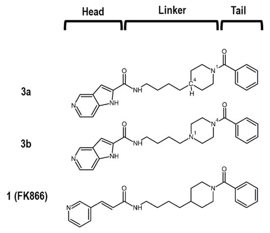 Many NAMPT inhibitors bind to the tunnel-shaped cavity of NAMPT (Figure 1), although the role of this tunnel in NAMPT function remains unknown [18,19,20,21,22,23,24,25,26,27,28,29,30,31]. These inhibitors have a unique pharmacophore consisting of three parts (Figure 2): head (a pyridine-like aromatic moiety), linker (a tunnel-interacting moiety) and tail (a solvent-exposed bulky group). To get more valuable insights into the tunnel cavity for the development of effective NAMPT inhibitors, we structure-basically designed and synthesized two close structural analogues of NAMPT inhibitors, namely azaindole–piperidine (3a)- and azaindole–piperazine (3b)-motif compounds, which were modified from the head and linker moieties of 1 (Figure 2, Scheme 1). Since the tail acts as a packing moiety against the solvent exposed tunnel exit surface, the tail structures of 3a and 3b were fixed as the same benzoyl group of 1. The nitrogen-containing aromatic heads present in many NAMPT inhibitors mimic the natural NAM substrate of the enzyme [18,19,20,21,22,23,24,25,26,27,28,29,30,31]. However, the head moiety of vinylpyridine ring of 1 (Figure 2) is known to be able to non-specifically interact with proteins [43,44]. Based on this knowledge, we first replaced this head to the 5-azaindole heterocyclic ring to improve the specificity to NAMPT (Figure 2). Secondly, as the linker moiety of azacyclohexane may be considered to become a critical motif for NAMPT inhibitory activity, we synthesized a close structural set of piperidine (3a)- and piperazine (3b)-motif NAMPT inhibitors according to the methods of Bair et al. [45] and Vogel et al. [46], respectively (Scheme 1).