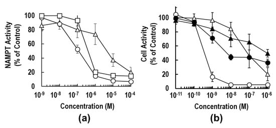 For the inhibitory effects of 3a and 3b on NAMPT activity, recombinant NAMPT activity was measured using a coupled-enzyme reaction system (CycLex NAMPT Colorimetric Assay Kit: MEDICAL & BIOLOGICAL LABORATORIES CO., LTD., Nagoya, Japan) according to the manufacturer’s instructions, as described previously [31,36,37]. Briefly, NAMPT enzyme and tested compounds were put on the 96-well transparent plate. The mixture of the rest of contents (ATP, NAM, PRPP, nicotinamide nucleotide adenylyltransferase 1 (NMNAT1), water-soluble tetrazolium salts (WST-1), alcohol dehydrogenase, diaphorase and ethanol (EtOH)) were then added onto the wells. After a brief incubation, the absorbance of the samples was detected at 450 nm on every 10 min until 60 min using a SYNERGY HTX (BioTek Instruments, Inc.; Winooski, VT, USA). The inhibition rates were calculated by the initial slope of the absorbance of the tested samples divided by that of the control wells. The IC50 values for the samples were calculated by 4-parameter logistic regression using Image J 1.48v (https://imagej.nih.gov/ij/).