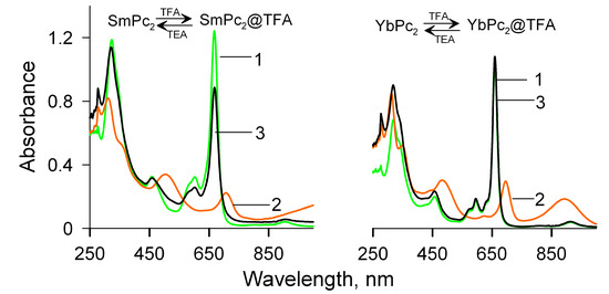 Dyrda, G.; Zakrzyk, M.; Broda, M.A.; Pędziński, T.; Mele, G.; Słota, R. Hydrogen Bond-Mediated Conjugates Involving Lanthanide Diphthalocyanines and Trifluoroacetic Acid (Lnpc2@TFA): Structure, Photoactivity, and Stability. Molecules 2020, 25, 3638. https://doi.org/10.3390/molecules25163638