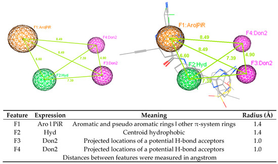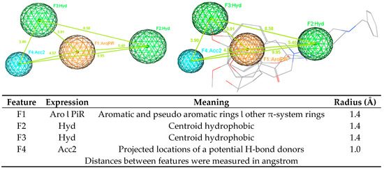 Two pharmacophore model sets were developed, including 13 models (A1–A13) for AChE and 11 models (B1–B11) for BACE-1. These models were built with four clinical in used drugs or used to be approved substances (A1–A13), or four substances being in clinical development (B1–B11) (Figure 3 and Figure 4). These models were evaluated with the validation sets for their performance; from this the best models would be chosen for further process. In the validation process, the active and decoy sets were downloaded from the website http://dude.docking.org/. After processing the downloaded data sets, including removing duplicate entries based on Cluster codes tool in the software Molecular Operating Environment (MOE) 2008.10 [25], and eliminating the structures used in the training sets (if any), the obtained sets (Table 2) were used for validating built pharmacophore models. The evaluation results of two chosen models (A1 and B1) are indicated in Table 3, more detail about the validation results of developed pharmacophore models are showed in the Supplementary Materials (Tables S1 and S2). The validation results of developed pharmacophore models indicated that these models (Models A1 and B1 in Figure 5 and Figure 6, respectively) had the good performance and could be used in the virtual screening process with the high reliability.
