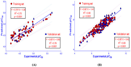 In Equations (1), (2), (10), and (11), and are, respectively, the observed and predicted activity values; while and are, respectively, the mean values of and . In Equations (3) and (4), and are, respectively, the observed and predicted activity values in LOO cross-validation. Equations (6) and (7) were utilized to calculate correlation coefficients between observed and predicted activity values of the compounds of validation set with () or without intercept () in case of using predicted data on the y-axis and experimental data on the x-axis, while () and () are, respectively, the same coefficients in the opposite case. The most stringent validation criteria thresholds including ≥ 0.65; CCC ≥ 0.85; ≥ 0.5; ≤ 0.2; and > 0.6 were applied to verify the external predictivity of good models [66,67,68,69].