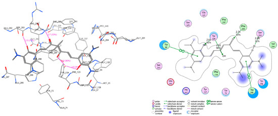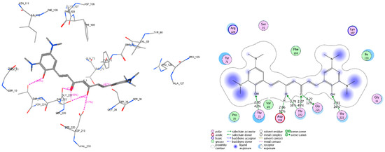 The molecular docking models were built and validated as satisfactory, except for 5HTZ with all the RMSD (root mean square deviation) values were more than 2.0 (Å) (Table S6). Therefore, this co-crystalized complex was not used in the next docking process. The screened derivatives were then successfully docked, with some exceptions, into the binding cavity of AChE (1ACJ, 1DX6, 1EVE, 1W6R, 4EY6, 4EY7) and BACE-1 (3VEU, 4B78, 5HTZ, 5HU0, 5HU1). The substances with high predicted values of pIC50 and good docking scores (most negative) on both enzyme targets would be considered as the most potential candidates for chemical synthesis and biological activity testing. The docking results of several derivatives are presented in Table 6 and Figure 9, Figure 10 and Figure 11. The more detail of docking results predicted pIC50 of all screened compounds are shown in the Supplementary Materials with the structures of all 47 screened substances also indicated (Tables S7–S10).