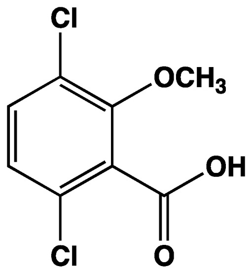 Dicamba (3,6-dichloro-2-methoxy benzoic acid; Figure 1), a chlorinated derivative of o-anisic acid, is an herbicide commonly used to control broadleaf weeds in various sites. Dicamba was originally introduced in the late 1960s and, currently, is commercially sold in its salt-based formulations under brand names such as Banvel®, Diablo®, Oracle®, Vanquish®, and XtendiMax® in the United States. Dicamba has a similar mode of action as phenoxy carboxylic acids, which at low doses show similar effects as the class of plant growth hormone auxins and at high concentrations stimulates abnormal cell growth in meristematic cells that results in the blockage of phloem vascular tissue [1]. Off-target effects from herbicides on adjacent fields is a common occurrence in modern agriculture. Dicamba is particularly problematic because, in its acid form, it is moderately volatile and is prone to vapor drift. Dicamba volatility has been widely reported through several on-field and controlled environment studies [2,3,4,5,6,7,8]. Reports have indicated that different crop species such as cotton, groundnut, tomatoes, soybean, watermelon, grapes, ornamentals, and certain tree species in neighboring fields had been damaged by dicamba vapor or drift over the last decade [3,9]. Therefore, there has been demand for rapid, efficient, robust, and sensitive analytical methods to monitor for the presence of dicamba in air and water samples.