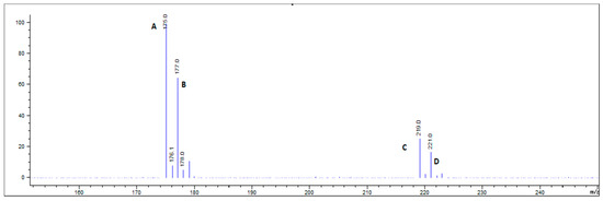 Mass spectrometry (MS) full scan spectrum of dicamba analytical standard showing isotopic pattern corresponding to 35Cl m/z 175 (A) and m/z 219 (C), and 37Cl m/z 177 (B) and m/z 221 (D).