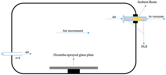 To fully evaluate air sample extraction, we performed vapor chamber experiments using glass plates (Figure 4) similar to those conducted with plants in other herbicide volatility studies [6,23]. Glass plates with a surface area of 190 cm2 were sprayed with selected dicamba formulation using a single-nozzle, track-mounted research sprayer calibrated to deliver 140 L ha−1 per pass using a Turbo Teejet Induction nozzle (TTI 11002) (Teejet Technologies, Springfield, IL, USA). The dicamba diglycolamine (DGA) salt formulation of dicamba (XtendiMax®) was applied at rates of 560 and 2240 g ae ha−1. After spraying, glass plates were transferred to the vapor chambers. The vapor chambers had an internal volume of 6.2 L and holes at both ends to maintain air movement inside the chamber and across the treated surface. Four holes (diameter 0.794 cm) for the air inlet and a single hole (1.27 cm) for the air outlet were made in the opposite direction of the chamber. Airflow rate was maintained at 310 mL min−1 with Dwyer airflow meters (Dwyer Instrument, Michigan City, IN, USA), resulting in a full turnover of air in the chamber every 20 min. The chambers were placed in a controlled environment growth chamber set to 35 °C and 40% relative humidity during the treatment period. Air samplers for the collection of dicamba were connected to chambers using glass tubes containing 270 mg of XAD-2 sorbent. Both ends of the glass tubes were sealed with 1 and 0.5 cm PUF plugs to avoid any spill or movement of polymer sorbent particles inside the tube. Air sampling was conducted for a period of 48 h. The XAD-2 sorbent and PUFs were carefully transferred into 15 mL polypropylene centrifuge tubes and 10 mL methanol was added. Next, 25 µL of 100 µg mL−1 D3-dicamba solution were also added and tubes were kept for overnight shaking at 4 °C to elute dicamba from the sorbent and from the PUF into the solvent. The next day, the methanol was transferred to new tubes and concentrated to dryness using the TurboVap® LV system (Biotage LLC, Charlotte, NC, USA) under N2 gas at 30 °C. Dicamba residues were then resuspended to a final volume of 200 μL in ACN with 0.1% (v/v) formic acid and 20 µL were analyzed using the above described single-quadrupole LC–MS method. The results reproducibly show an increased amount of dicamba detected when comparing application rates of 560 and 2240 g ae ha−1. These data indicate that a stable drift and/or volatilization of dicamba occurred off of the glass plates (Table 3). It is important to note that this non-reactive surface does not necessarily reflect a plant surface where dicamba interacts with surface ions and is absorbed into the leaves over time. These data do show, however, the precision and reproducibility of the developed method for extracting dicamba from PUF plugs and of the subsequent analysis using our established single-quadrupole LC–MS method.
