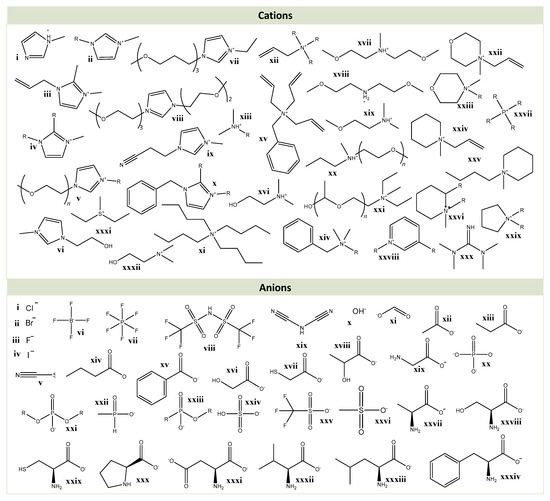 Ionic liquids (ILs) (Figure 2) are salts generally composed of a large organic cation and a smaller organic or inorganic anion, possessing a melting temperature below 100 °C. Their low melting temperature is governed by their low charge density and low symmetry ions in their composition [95]. ILs are also described as “designer solvents” due to the numerous combinations of the existing cations and anions that can form an IL, allowing to tailor them for specific applications [96]. In general, if properly designed, ILs present several interesting properties, such as electrical conductivity, negligible vapor pressure, low flammability, tunability and excellent thermal stability, and are good solvents for a wide range of polar and non-polar compounds. The negligible vapor pressure and high thermal stability stand out as excellent advantages over conventional volatile organic solvents [95]. Furthermore, ILs may be less toxic than traditional volatile organic solvents, although a comprehensive toxicity evaluation is still required [97]. Nevertheless, due to their “designer solvents” feature, it is possible to design ILs with low toxicity [98]. Actually, ILs containing more biocompatible cations and anions, derived from relatively inexpensive and eco-friendly natural resources, such as carbohydrates and amino acids, have been emerging. Cholinium-based ILs, whose cation can be found in nature, are a major example of ILs with low toxicity [1]. ILs began to be applied as electrolytes in battery applications in 1970 [99] and their applications rapidly shifted to several fields, such as organic chemistry and biochemistry [100], biomass fractionation [25,101], extraction of carbohydrates [5,94,102,103] and other biomolecules [96]. Additionally, ILs have been used as biomass delignification media as they are able to remove lignin and to expose the carbohydrate fraction for enzymatic hydrolysis [104]. In addition, some ILs have been reported to completely dissolve biomass [101].