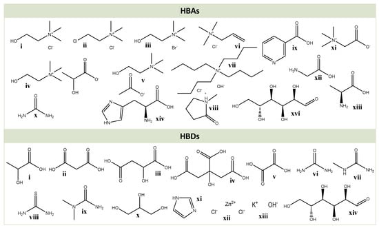 Chemical structures of the DESs’ HBDs and HBAs reviewed in this work.