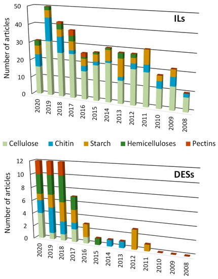 Figure 4 summarizes the growth of the scientific papers related to this subject divided by type of solvent and polysaccharide. As expected in the field of ILs, cellulose has the higher bulk of scientific papers published, followed by chitin and starch. The number of papers published follows closely the abundance of each polysaccharide in nature, being hemicelluloses and pectins less studied due to their lower abundance in nature. Nonetheless, hemicelluloses have started to gain more interest in recent years. DESs, on the other hand, do not present the same tendency as ILs. Firstly, the bulk of work is much lower when compared with ILs, which is in accordance with their novelty. Moreover, the first works published using DESs focused mostly on starch and chitin instead of cellulose, which only began to be studied in 2016. The studies with DESs also focus more on pectins and hemicellulose, which could be a consequence of the poor results achieved with ILs with these two polysaccharides.