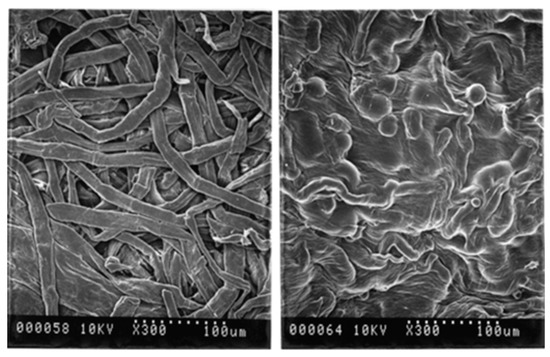 SEM micrographs of cellulose pulp fibers before (left) and after dissolution in [C4C1im] Cl (right). Reprinted with permission from [133]. Copyright (2020) American Chemical Society.