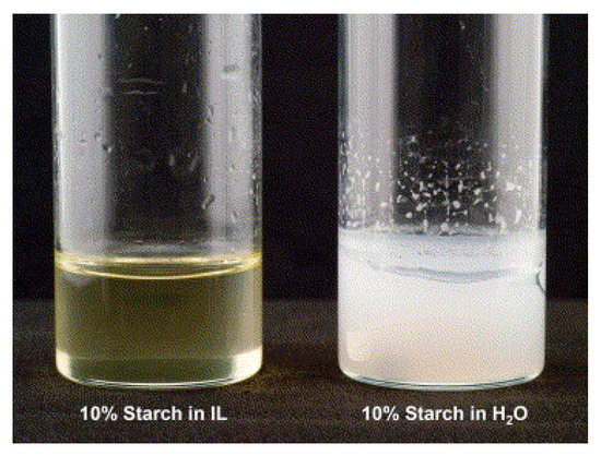 Picture demonstrating total solubilization of starch (wt.%) in 1-butyl-3-methylimidazolium dicyanamide and partial solubilization in water. Reprinted from [52], with permission from Elsevier.