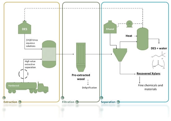 - Morais, E.S.; Mendonça, P.V.; Coelho, J.F.J.; Freire, M.G.; Freire, C.S.R.; Coutinho, J.A.P.; Silvestre, A.J.D. Deep Eutectic Solvent Aqueous Solutions as Efficient Media for the Solubilization of Hardwood Xylans. ChemSusChem 2018, 11, 753–762. [Google Scholar] [CrossRef] [PubMed]