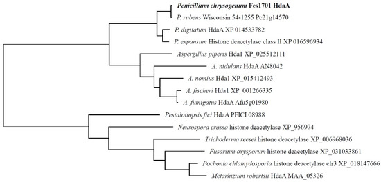 Fungal genomic DNA was isolated using the CTAB method [25]. The oligonucleotide sequences of PCR primers are listed in Table S1. The HdaA protein sequence of P. chrysogenum Wisconsin 54-1255 (Pc21g14570) was used as query to perform BLAST searches to find its ortholog in the strain Fes1701. The genome sequence of P. chrysogenum Wisconsin 54-1255 was obtained from the European Molecular Biology Laboratory (EMBL) (Heidelberg, Germany) under accession numbers AM920416–AM920464. The designed PCR primers PchdaA-F and PchdaA-R were used to amplify the hdaA ORF from the genomic DNA of strain Fes1701 using the TransStart® FastPfu DNA Polymerase (TransGen Biotech, Beijing, China). A 3.0-kb fragment was obtained and subcloned using a pEasy® Blunt Cloning Kit (TransGen Biotech, Beijing, China) to yield pEasy-PcHdaA and sequenced by Sangon Biotech (Shanghai, China). The sequence data of the hdaA gene in strain Fes1701 were deposited in the GenBank Database under accession number MT313928. The coding sequence for amino acid polypeptide was predicted by the FGenesh software (Softberry Inc., NY, USA) [41]. Phylogenetic analysis of HdaA orthologs from strain Fes1701 and other fungi was performed using the MEGA 7.0 software [42].