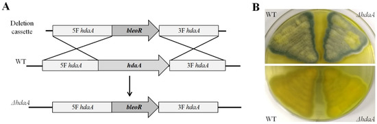 Generation and phenotype of the ΔhdaA strain. (A) Schematic illustration for hdaA disruption. The bleoR gene is amplified from the plasmid pZeo, and the bleomycin is used for the selection of transformants bearing the bleoR gene. Transformation was performed by homologous recombination using the protoplast transformation method. (B) The phenotype of the ΔhdaA and WT strains grown on PDA plates (25 °C for 5 days).