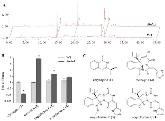 Secondary metabolite profiles of ΔhdaA and WT strains. (A) HPLC analysis of secondary metabolite profiles. (B) Relative amounts of four main products 1–4 in ΔhdaA compared with the WT. Mean values with asterisks are significant. (C) The chemical structure of the four main products detected in this study: 1, chrysogine; 2, meleagrin; 3, roquefortine C; 4, roquefortine F. The analysis for each strain was performed in triplicate. Mean values with asterisk are significant at p < 0.01.