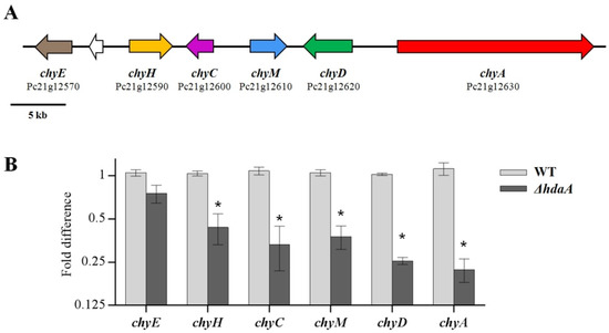 Because the deletion of ΔhdaA greatly influenced the production of chrysogine (1) and meleagrin (2), we further investigated the differences in the transcriptional levels of genes from two BGCs encoding the enzymes responsible for the production of these two compounds between the ΔhdaA and WT strains. Chrysogine (1) is a yellow alkaloid produced by several filamentous fungi, such as the genera Penicillium, Aspergillus, and Fusarium [32]. Although this compound was first isolated in 1973, its BGC was not clarified until 2017 [32,33]. Viggiano et al. [33] elucidated the chrysogine biosynthetic pathway in P. chrysogenum and identified the function of each enzyme involved in this pathway. The P. chrysogenum chrysogine biosynthetic pathway contains a NRPS (Pc21g12630) flanked by five associated genes (Pc21g12570, Pc21g12590, Pc21g12600, Pc21g12610, and Pc21g12620), designated as chyA to chyH (Figure 4A). In our study, the transcriptional levels of these genes contained in the chrysogine BGC in ΔhdaA were significantly downregulated as compared with the WT (Figure 4B). Thereinto, the transcriptional levels of Pc21g12630 (chyA), which encodes an NRPS, and Pc21g12620 (chyD), which encodes an amidase, showed a 4.0-fold and 5.0-fold decrease in ΔhdaA, respectively. A similar phenomenon was observed by Guzman-Chavez et al. [34], who also reported that the inactivation of HdaA caused the downregulation of chrysogine BCG expression in the industrial strain P. chrysogenum DS68530.