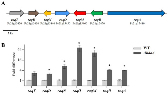 In P. chrysogenum, the meleagrin/roquefortine BGC is a seven-gene cluster extending from Pc21g15420 to Pc21g15480 (Figure 5A). It encodes proteins from the biosynthetic pathway where, as was confirmed, roquefortine C is a biosynthetic precursor of meleagrin [35]. The biosynthesis of roquefortine depends on the involvement of the upstream genes, including the Pc21g15420 (roqT), Pc21g15430 (roqD), Pc21g15440 (roqN), and Pc21g15480 (roqA) genes. Subsequently, the Pc21g15450 (roqO) and Pc21g15460 (roqM) genes, which respectively encode a P450 scaffold reorganizing oxygenase and a MAK1 monooxygenase, are responsible for the biotransformation from roquefortine to meleagrin [35]. In our study, a comparative analysis of the transcriptional levels showed that these upstream genes responsible for roquefortine were 2.5- to 7.5-fold upregulated in ΔhdaA (Figure 5B). Furthermore, most significant enhancements appeared downstream of this pathway, which were essential for the biosynthesis of meleagrin. In this stage, Pc21g15450 (roqO) and Pc21g15460 (roqM) showed an 84.8- and 43.7-fold increase in ΔhdaA (Figure 5B). This phenomenon was relevant to the production increase of the meleagrin/roquefortine BGC in the ΔhdaA strain. The productions of roquefortine and related compounds exhibited a significant increase, while meleagrin appeared in the metabolite profiling of the ΔhdaA strain as a newly generated compound (Figure 3A). In the previous report, the production of meleagrin/roquefortine-related compounds in P. chrysogenum were unaffected by the inactivation of HdaA [34]. However, the production of these compounds in the ΔhdaA strain were significantly increased in this study. This phenomenon could indicate that the secondary metabolic pathway in the same fungal species derived from different habitats may be affected synergistically by other additional regulatory mechanisms. For example, a heterotrimeric Ga protein Pga1 has been reported to upregulate the biosynthesis of roquefortine in P. chrysogenum Wis54-1255 [36]. Our results demonstrate that it is important to reveal the different effects of epigenetic regulators in the same organism on secondary metabolism.