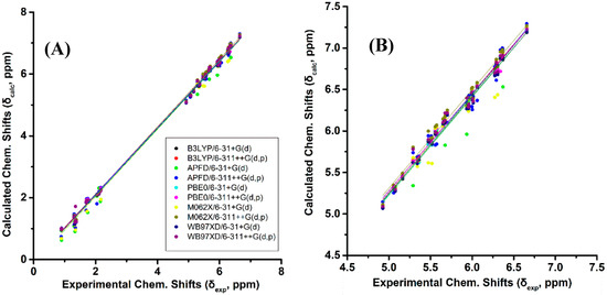 (A) Calculated, δcalc, 1H-NMR chemical shifts (at the GIAO/B3LYP/6-311+G(2d,p) level of theory with CPCM in CHCl3/CH3CN) vs. experimental, δexp, chemical shifts with energy minimization using various functionals and basis sets for (Z)-1,3-pentadiene, (E)-1,3-pentadiene, (E,Z)-2.4-hexadiene, (E,E)-2,4-nonediene, (Z,Z)-2,4-nonediene, (E,Z)- 2,4-nonediene, and (Z,E)-2,4-nonediene (Figure 1). (Β) Calculated, δcalc, 1H-NMR chemical shifts of the olefinic protons vs. experimental, δexp, chemical shifts of the data of Figure 2A.