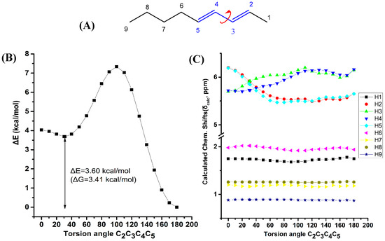 Effect of variation of the C4C5C6C7 torsion angle of (E,E)-2,4-nonediene (A) on the electronic energy ΔΕ(kcal·mol−1) (B), and the 1H-NMR chemical shifts (C) with energy minimization at the B3LYP/6-31+G(d) level. The Gibbs energy difference, ΔG, of the two low energy conformers is also indicated.