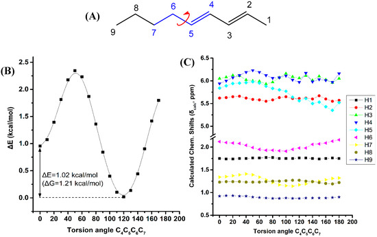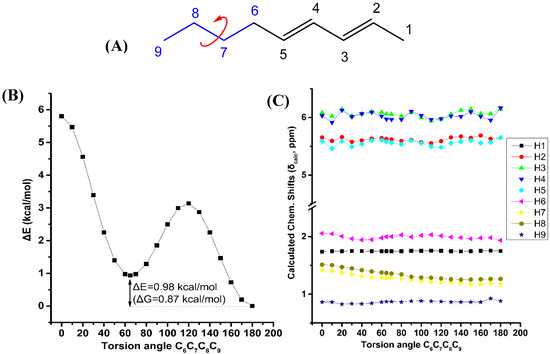Effect of variation of the C6C7C8C9 torsion angle of (E,E)-2,4-nonediene (A) on the electronic energy ΔΕ(kcal·mol−1) (B), and the 1H-NMR chemical shifts (C) with energy minimization at the B3LYP/6-31+G(d) level. The Gibbs energy difference, ΔG, of the two low energy conformers is also indicated.