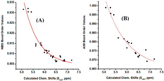 Figure 8A illustrates a plot of NBO bond order of the olefinic C–H bonds vs. δcalc(1H). The resulting good correlation (R2 = 0.903) demonstrate that the NBO bond order is a primary factor which determines δcalc(1H). Similar correlation was obtained when the AIM bond order [43] was plotted vs. δcalc(1H) (Figure 8B). On the contrary, no functional relationship was found for both NBO and AIM charge densities of the olefinic C-H protons vs. δcalc(1H).