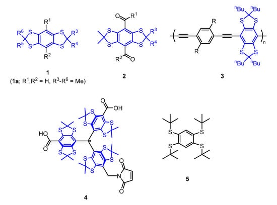 Lewis structures of benzo[1,2 d;4,5 d′]bis[1,3]dithioles 1, “S4-DBD” dyes 2, thioketal containing conjugated polymers 3, spin label 4● and 1,2,4,5-tetrakis(tert-butylthio)benzene 5. For the sake of clarity, the benzo[1,2-d;4,5-d′]bis[1,3]dithiole motif is highlighted in blue.