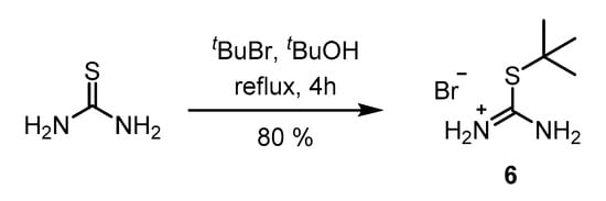 Though S-tert-butyl isothiouronium halides were occasionally described in older literature [36], the procedures applied for their synthesis utilized gaseous hydrogen halides rendering them inconvenient and dangerous. In contrast, S-n-alkyl isothiouronium halides are easily prepared by reaction of the corresponding alkyl halide with thiourea in refluxing ethanol [34,37], but the competing elimination dominates the reactivity of tertiary alkyl halides inhibiting the formation of the desired S-tert-butyl isothiouronium salt. Accordingly, the reaction of thiourea with tert-butyl bromide in refluxing ethanol yielded pure S-ethyl isothiouronium bromide (Figure S3). This issue was circumvented by replacing EtOH for t-BuOH, so that the only electrophile in the reaction mixture was the tert-butyl group. Consequently, pure S-tert-butyl isothiouronium bromide 6 was obtained in a yield of 80% after recrystallization on a 10 g scale as shown in Scheme 1.