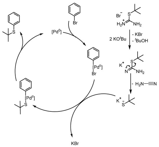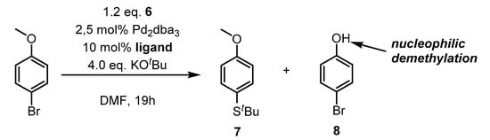 Considering the aforementioned transformation of 4-bromoanisole so 7, Park et al. [30] used a Pd(dba)2/dppf catalyst system and obtained a yield of 87% using S-tert-butylthioacetate as sulfur source, however with an increased temperature of 110 °C. Exploiting the in situ formation of thiolates from tert-butyl bromide and thiourea, Wang et al. [31] obtained S-tert-butylthiobenzene (yield 76%) and 4-nitro-S-tert-butylthiobenzene (yield 77%) from the respective aryl bromides using a Pd2dba3/XPhos catalyst system and yields were significantly higher for primary alkyl substrates.