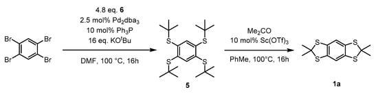 In the present study, the olfactory hazard and lack of conversion was circumvented by synthesis of S-tert-butyl isothiouronium bromide from thiourea and tert-butyl bromide and its use as thiolate source in a subsequent cross-coupling reaction. Since the isothiouronium salt is completely odorless and the thiolate appears only in situ, the described process enables odorless access to benzo[1,2-d;4,5-d′]bis[1,3]dithioles and this with improved yields. It should be noted, that S-tert-butyl isothiouronium bromide has already been applied as a thiolate source for the functionalization of electron-poor heterocycles via nucleophilic substitution reactions [32,33]. Furthermore, a smoother conversion of 5 to the thioketal 2,2,6,6-tetramethyl- benzo[1,2-d;4,5-d′]bis[1,3]dithiole 1a by use of catalytic amounts of Sc(OTf)3 was possible, which in comparison to previous protocols avoids the use of large amounts of hazardous Lewis acids like HBF4 and BF3.