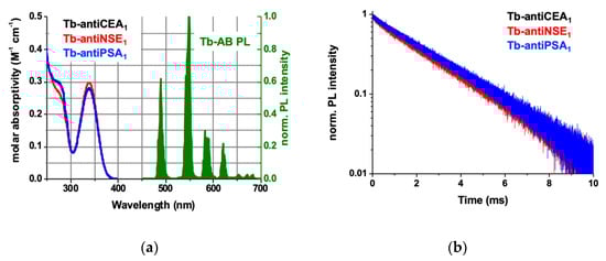 Owing to the small size of Tb compared to a full IgG AB and the sensitivity benefits when many Tb donors surround one QD acceptor [44], Tb was conjugated to full IgG primary antibodies against the different tumor markers. Lumi4–Tb–NHS complexes were directly labeled to available primary amines on the IgG ABs against CEA (antiCEA1), NSE (antiNSE1), and PSA (antiPSA1). Tb-per-IgG conjugation ratios of approximately 10 ± 2 (Tb–antiCEA1), 13 ± 3 (Tb–antiNSE1), and 10 ± 2 (Tb–antiPSA1) were determined by UV-Vis absorption spectroscopy as described in the Methods Section 4.2 and shown in Figure 1a and Table 1. Upon excitation at 365 nm, the PL spectrum of Tb–AB showed the characteristic Tb emission lines around 495 nm, 545 nm, 585 nm, and 625 nm, and between circa 650 nm and 700 nm. The obtained PL decay curves acquired at 490 ± 0.5 nm displayed an almost single exponential and long decay with an average PL lifetime of approximately 2.6 ms (Figure 1b). Notably, the photophysical properties of Tb do not change significantly upon bioconjugation, and the absorption and emission spectra as well as the PL decay of Tb alone (not conjugated to an AB) are almost exactly the same as those shown for the Tb–AB conjugates in Figure 1. The only differences are the AB absorption (below 300 nm) and the PL lifetime, which is 2.7 ms and monoexponential for Tb instead of 2.6 ms and biexponential (very weak fast decay component in addition to the long 2.7 ms lifetime component of Tb) for Tb–AB.