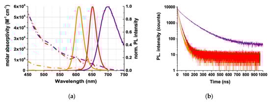 The unique PL properties of lanthanide complexes are ideally suited for their application as donors in Förster resonance energy transfer (FRET) biosensing [24,25,26]. Upon FRET, the long PL lifetime of the lanthanide donor is transferred to the acceptor, and a time-gated PL intensity detection (in a specifically delayed temporal detection window after pulsed excitation) of both donor and acceptor can be used for background-free and ratiometric FRET biosensing [27]. This background-free time-gated detection presents the important advantage over conventional steady-state FRET, which is also ratiometric, but all background from autofluorescence and directly excited acceptor fluorescence interferes with the analyte-specific FRET signals, such that the sensitivity is normally significantly reduced. In particular for Tb, the well-separated emission bands allow for FRET to different acceptors, which enables multiplexed FRET detection of different acceptors with only one type of donor [28,29]. A powerful combination is the utilization of luminescent semiconductor quantum dots (QDs) as FRET acceptors for lanthanide donors [30,31,32]. Despite the strong direct excitation of QDs by any wavelength shorter than their PL bands, the long excited states of lanthanides store the energy until the QDs have decayed back to their ground states and become efficient acceptors for FRET from the lanthanides that remained in their excited states. In principle, the narrow and color-tunable PL emission bands of QDs are well adapted to perform multiplexed lanthanide-to-QD FRET [32,33]. We previously developed five-fold Tb-to-QD FRET multiplexing in a biotin-streptavidin proof-of-concept study [34] and triplexed Tb-to-QD FRET for microRNA quantification [35]. However, the actual application of Tb-to-QD FRET multiplexing in antibody-based immunoassays is significantly more challenging. Although QDs possess superior photophysical properties than fluorescent dyes, the latter are significantly smaller, and the preparation of functional fluorescent dye–antibody conjugates for FRET sandwich immunoassays is simpler [29]. Until recently, we could only realize duplexed Tb-to-QD immunoassays using the epidermal growth factor receptors EGFR and HER2 as model biomarkers [36] and a proof-of-concept study concerning triplexed immunoassays using three QD colors but only a single serum biomarker (prostate-specific antigen, PSA) [37].