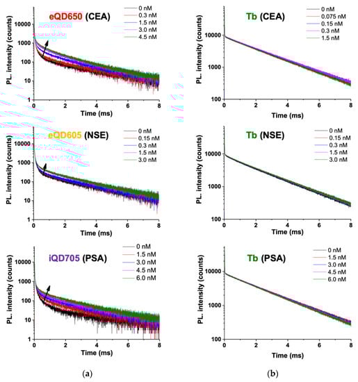Figure 3. PL decay curves of (a) QD acceptors and (b) Tb donors with increasing concentration of carcinoembryonic antigen (CEA), neuron-specific enolase (NSE), and prostate-specific antigen (PSA), respectively. Black curves represent the Förster resonance energy transfer (FRET) pairs in the absence of antigens (AG). Very short decay components (in the µs range) arise from the direct excitation of QDs (visible only in (a)), and very long decay components (in the ms range) arise from unquenched Tb (visible in both (a) and (b)). With increasing AG concentrations, a new FRET decay component (in the tens to hundreds of µs range) can be observed with increasing intensity (as indicated by the black arrows in (a)).