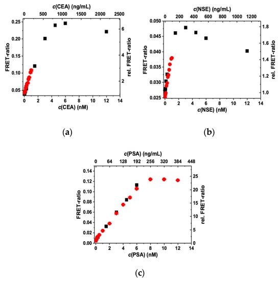 Figure 4. FRET ratios and relative FRET ratios (normalized to unity at 0 nM antigen concentration) of TG QD and Tb PL intensities (0.1 to 0.9 ms after pulsed excitation) as a function of antigen concentration. (a) Tb–eQD650 FRET pair for the detection of CEA; (b) Tb–eQD605 FRET pair for the detection of NSE; and (c) Tb–iQD705 FRET pair for the detection of PSA. The red data points contain more measurements at low concentrations and were used for the determination of limits of detection (LoDs) (cf. Table 2). Only the linear part of the red data points in (c) was used for LOD calculation.