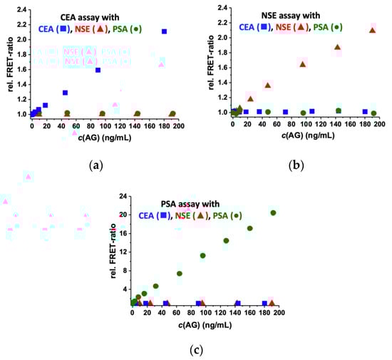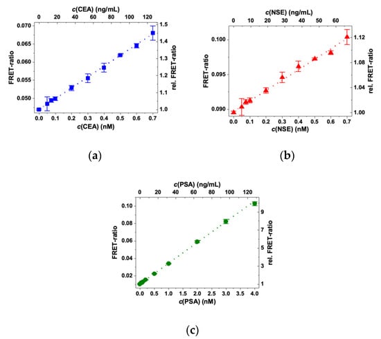Encouraged by the almost negligible optical and biological crosstalks and the low LoDs for the single tumor markers in the multi AB FRET-pair samples, we proceeded to the triplex detection of CEA, NSE, and PSA from a single 50 µL serum sample. In the triplexed immunoassays, the samples with increasing concentrations of CEA, NSE, and PSA were mixed with solutions of 100 µL containing all three FRET AB pairs at constant concentration, similar to those in the single FRET-pair immunoassays. Due to the triplexed format, the overall concentration of ABs was three times higher than in the single tumor marker assays. Despite the presence of six different ABs and three different AGs in the assays, the different FRET ratios specifically increased with increasing concentrations of their respective AGs (Figure 7). The LoDs (Table 3) were only slightly higher than those of the single AG assays with all AB FRET pairs and, with 3.6 ng/mL for CEA, 3.5 ng/mL for NSE, and 0.3 ng/mL for PSA, they were still well below the clinical cut-off levels of the tumor markers.