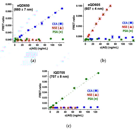 Optical crosstalk (or channel bleedthrough) can occur when the PL spectrum of one acceptor is covered by the optical bandpass filter of the detection channel of another acceptor. In those cases, the PL intensity increase of one acceptor would lead to a FRET ratio increase in the detection channels of more than one acceptor, again leading to (usually) positively biased AG concentrations. To evaluate optical crosstalk, we inspected the detection of (1) eQD605 PL in the eQD650 (660 ± 7 nm) and iQD705 (707 ± 8 nm) detection channels; (2) eQD650 PL in the eQD605 (607 ± 4 nm), and iQD705 (707 ± 8 nm) detection channels; and (3) iQD705 PL in the eQD605 (607 ± 4 nm) and eQD650 (660 ± 7 nm) detection channels. Therefore, we devised immunoassays, in which all FRET pairs (antiCEA, antiNSE, and antiPSA ABs) were present, the concentration of one antigen (CEA, NSE, or PSA) was increased, and the FRET ratios were determined from all three QD detection channels (Figure 6). Although all non-specific optical crosstalk signals were extremely low, we observed minor contributions from iQD705 in the eQD650 detection channel (CEA) and from eQD650 in the eQD605 detection channel (NSE). The iQD705 detection channel showed no optical crosstalk at all. The use of spectrally well-separated QD emission bands and narrow optical bandpass filters allowed us to successfully minimize optical crosstalk to almost background levels, which makes the three QD acceptors ideally suited for multiplexed FRET detection. This is remarkable when compared to the optical crosstalk of different dyes acceptors, which require correction for application in multiplexed biosensing [29,47].