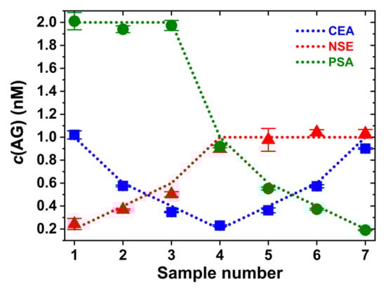 Although these triplexed calibration curves already demonstrated the good performance of Tb-to-QD multiplexed immunoassays, the probability of finding different tumor markers at the same concentration within the same sample is quite low. Therefore, we devised a more realistic scenario, in which we challenged our multiplexed FRET immunoassay with a combination of high and low AG concentrations. Seven different samples containing CEA, NSE, and PSA at different and varying concentrations ranging from 0.2 nM to 2 nM were prepared, and the measured FRET ratios were translated into AG concentrations using the calibration curves from Figure 7. The triplexed CEA/NSE/PSA immunoassay (data points in Figure 8) could very well identify the different concentrations (dotted lines in Figure 8 represent the actual concentrations) within the seven different sample compositions with only a few significant deviations and without any biological or optical crosstalk correction.