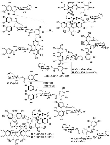- Ito, H.; Yamaguchi, K.; Kim, T.H.; Khennouf, S.; Gharzouli, K.; Yoshida, T. Dimeric and trimeric hydrolyzable tannins from Quercus coccifera and Quercus suber. J. Nat. Prod. 2002, 65, 339–345. [Google Scholar] [CrossRef] [PubMed]