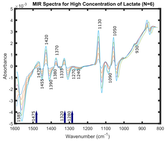 Figure 1. This figure represents six spectra of very high concentrations of lactate; 600 mM, 500 mM, 400 mM, 300 mM, 200 mM and 100 mM in PBS at pH of 7.4. These spectra were obtained and pre-processed by the same techniques as mentioned in the previous section. Spectra of these concentrations were taken solely for the purpose of visualization of the peaks for lactate ion and lactate containing compounds in the Mid-IR spectral region, as they were not visible distinctly for lower concentrations of lactate.