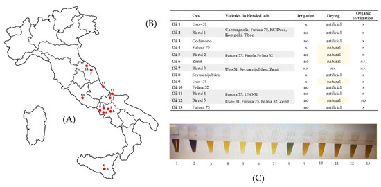 Cold-pressed hemp seed oils from different Italian locations. Main cultural and post-harvest techniques applied are indicated. n.r. = not reported. (A) Graphic distribution of hemp seed oils in the various Italian regions; (B) Main characteristics of hemp seed oils: cultivars, varieties, irrigation, drying and organic fertilization; (C) Visual representation of analyzed hemp seed oils.