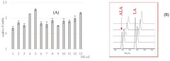 HS oil is a rare fount of nourishment for human diet, in particular for vegetarians, because of their unique reported ratio in ω-6/ω-3, most represented by linoleic acid (LA; 18:2, n-6) and α-linolenic acid (ALA; 18:3, n-3) [39]. The optimum ratio is approximately 2.5:1–3:1, also recommended for human nutrition [40]. Herein, the UHPLC analysis, combined with the quadrupole-time hybrid mass spectrometer (QTOF) high resolution, was utilized to detect and quantify fatty acids in analyzed oils. Taking into account relative areas of ω-6 and ω-3 fatty acids, their dietary ratio was calculated and data, which were in the range of 1.71–2.27, are listed in Figure 2. Several factors could affect fatty acids content and modify oil characters. Cultivars, climatic, farming and light conditions could strongly influence the ratio of ω6/ω3, in particular during seed development leading to the different content of acids in plants. Possessing high levels of unsaturated fatty acids protects the seeds from frost during the cold months of the year [36,41,42].