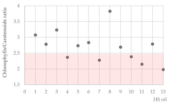 The ratio between the chlorophyll fraction and the carotenoid fraction greatly differed, demonstrating that the green and yellow fractions were not in balance (Figure 3). For other edible oils such as olive virgin oils, the ratio between the two isochromic fractions of pigments appeared to be constant at a value close to unity, independent of the variety [53]. There was a large variability for chlorophylls/carotenoids ratio within the hemp seed oil under study. In particular, hemp seed oil 8 was found to show the highest chlorophylls/carotenoids ratio, whereas only four samples, HS oils 4, 7, 11, and 13, appeared to contain a good carotenoids amount and a ratio less than 2.5. Among these latter oils, although no conclusions are drawn, HS oils 4 and 13 are obtained from Futura 75 cv. seeds, and HS oil 11 is a blend in which 2/3 seeds were from Futura 75 variety. The chlorophylls/carotenoids ratio is able to indicate phenology and physiology of plants. Different varieties from different sources, harvested in a similar ripeness state, possess different chlorophyll and carotenoid pigment profiles and content. Different chlorophyll a/b content and chlorophyll/carotenoid ratios caused by stress, damage, and senescence, impact the normal course of plant biological processes. Even though there is not a restrict regulation on the ratio between chlorophylls and carotenoids, it tends to remain more or less constant whatever the variety of sources, in a concentration range of 2.5 to 3.7 mg total chlorophyll/mg total carotenoid [53].