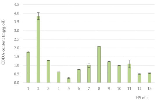 Cannabidiolic acid (CBDA) content (mg per g of oil) of the analyzed hemp seed oils, calculated by means of the calibration curve of a home-made isolated CBDA. Values are the mean of three independent measurements ± SD.