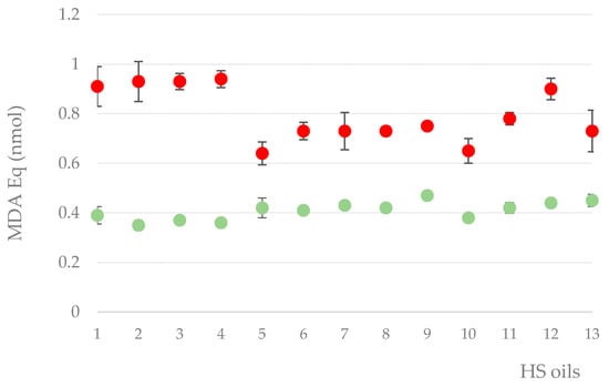 Thiobarbituric Acid Reactive Substances (TBARS) values, expressed as nmol of malondialdehyde (MDA) equivalents, in initial oils (●), and after 7 days accelerated photo-oxidation tests (●). Values are the mean of three independent measurements ± SD.