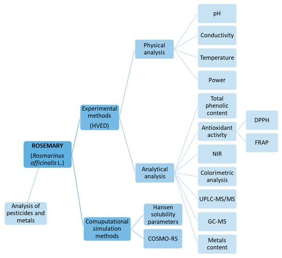 The extraction of BACs and volatile compounds from dried rosemary leaves were assessed by computational simulation methods and experimental analysis using HVED. Computational simulation methods were performed by HSPs and COSMO–RS where various green solvents were assessed in comparison with conventional solvent n-hexane in order to theoretically predict the probability of solution of BACs from rosemary. Experimental extraction method from rosemary was done using water and ethanol solutions (25 and 50%) as green solvents by means of HVED, and it was compared with modified CE under the same extraction conditions. The obtained extracts by CE and HVED were analyzed for physical parameters (pH, conductivity, temperature, and power), non-volatile compounds (total phenolic content (TPC), antioxidant capacity by 2-diphenyl-2-picrylhydrazyl (DPPH) free radical assay and ferric reducing antioxidant power (FRAP) method, NIR and ultra-performance liquid chromatography-tandem mass spectrometry (UPLC–MS/MS)), volatile compounds by headspace solid-phase microextraction/gas chromatography-mass spectrometry (HS–SPME/GC–MS), and metal content. Additionally, analyzes of pesticides and metals in dry rosemary leaves were performed to assess the safety of raw material for further processing and human consumption. The flowchart of all performed analysis from rosemary is presented in Figure 1.